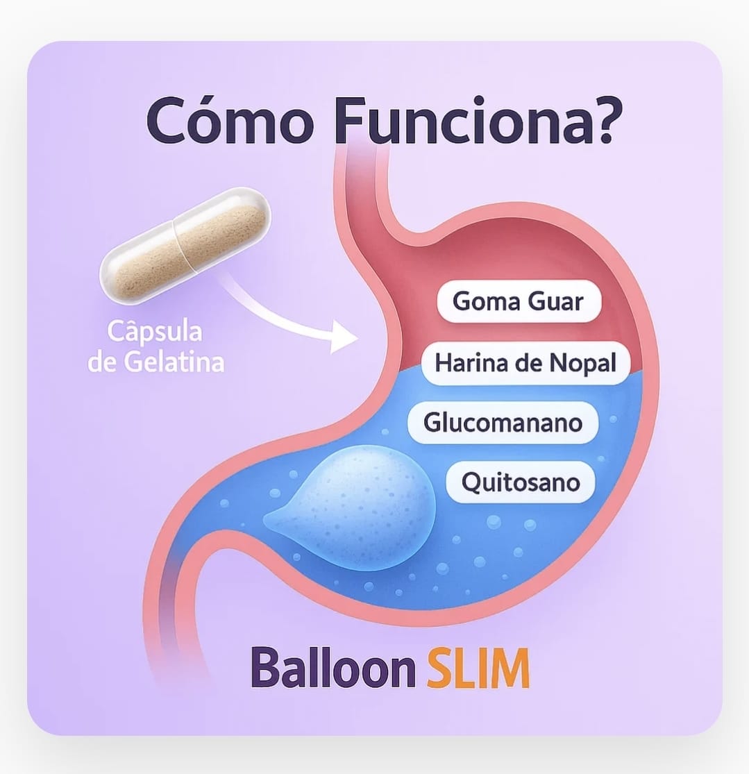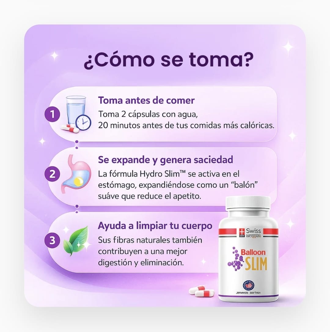 Balloon Slim es tu aliado para empezar a comer con más control y avanzar hacia tu objetivo de peso. Su fórmula está pensada para ayudarte a reducir el apetito y la ansiedad por comer, logrando que te sientas más satisfecho/a y puedas comer menos sin pasar hambre. Ideal si quieres retomar hábitos de forma gradual y constante, acompañando tu rutina diaria con un apoyo extra.